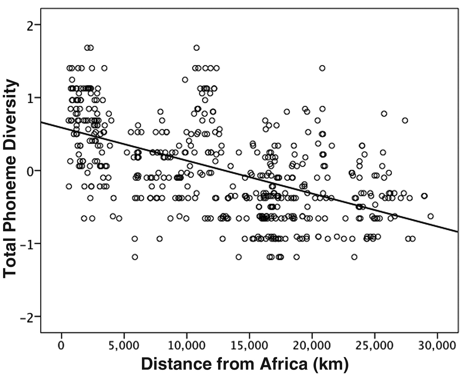 Il y a quelques semaines, Q. Atkinson de l’université d’Auckland a publié [3] une analyse similaire portant sur la diversité phonémique des langages, en utilisant le World Atlas of Language Structure (WALS). Les phonèmes sont en gros les sons élémentaires associés à une langue, ceux que l’on représente à l’aide de l’alphabet phonétique.