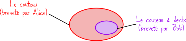 Alice a breveté le couteau, ce qui lui permet d’interdire à tous les autres de fabriquer et vendre des couteaux. Bob a breveté le couteau à dents, il peut interdire à tout le monde de faire des couteaux à dents. Moralité : Alice peut faire des couteaux, tant qu’ils ne sont pas à dents. Bob lui ne peut rien faire : puisque le couteau à dents est en particulier un couteau, Alice peut lui interdire d’en faire.