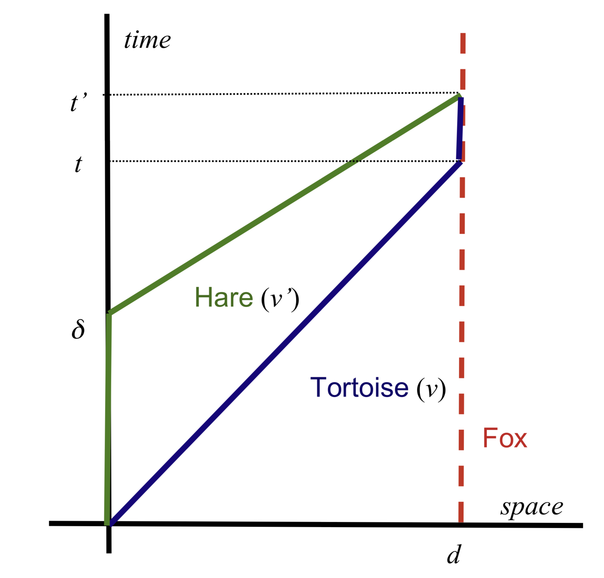 Dans cet article, l’auteur imagine une expérience du « Lièvre et de la Tortue » relativiste, dans lequel le lièvre part après la Tortue, arrive après elle. Le temps entre son départ et son arrivée sera jugé plus important par l’arbitre (le renard), mais le temps propre associé à la trajectoire du lièvre sera plus court que celui de la trajectoire de la tortue !
