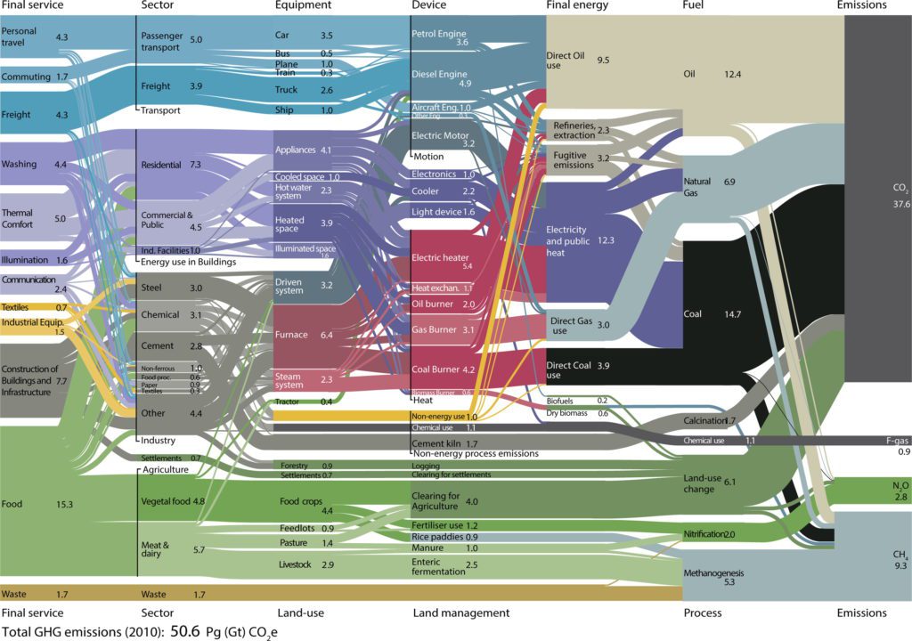 Chaque colonne représente une décomposition différente : par service rendu, par secteur, par type d’équipement, d’énergie finale, d’énergie fossile, et enfin par nature du gaz émis (il y a le CO2 bien sûr, mais aussi le méthane CH4, les gaz fluorés…c’est d’ailleurs pour ça qu’on évalue le total en « équivalent » CO2). Dans chaque colonne, le total doit en principe être égal à 50.6Gt d’équivalent CO2.