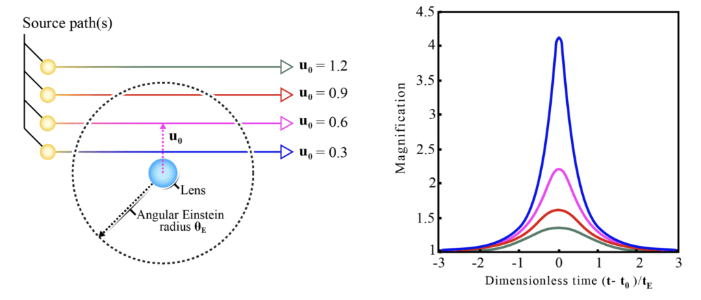Un truc que j’ai toujours du mal à bien faire passer quand on parle de microlentilles , c’est le fait que le phénomène existe même si la masse ne passe pas PILE entre l’observateur et l’étoile. On définit une notion de paramètre d’impact, qui est la distance minimale entre les deux lors du passage, et on peut calculer la forme du pic en fonction de ça.