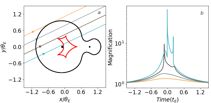 Par contre pour les caustiques, ça devient vite compliqué. En fonction de la distance angulaire à l’étoile, on peut avoir des courbes plus ou moins exotiques