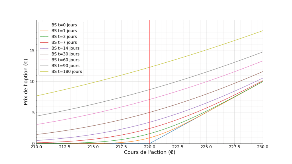 Il est assez utile de visualiser cela en traçant pour un prix d’exercice donné les courbes de valeur de l’option à différentes maturités en fonction du cours du sous-jacent. Voici un exemple pour des maturités allant de 1 à 180 jours sur mon exemple du blé avec un prix d’exercice de 220€.